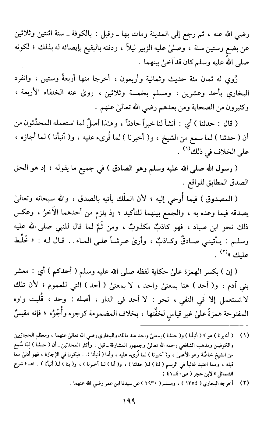(¬1) (أخبرنا) هو كـ (أنبأنا) و (حدثنا) بمعنًى واحد عند مالك والبخاري رضي اللَّه تعالى عنهما، ومعظم الحجازيين والكوفيين ومذهب الشافعي رحمه اللَّه تعالى وجمهور المشارقة -قيل: وأكثر المحدثين- أن (حدثنا) لِمَا سُمع من الشيخ خاصَّة وهو الأعلى، و (أخبرنا) لما قُرئ عليه، وأما (أنبأنا). . فيكون في الإجازة، فهو أدنى مما قبله، ومما اعتيد غالبًا في الرسم (ثنا) لـ (حدثنا)، و (أنا) لـ (أخبرنا)، و (بنا) لـ (أنبأنا). اهـ "شرح الشمائل" لابن حجر (ص 40 - 41)