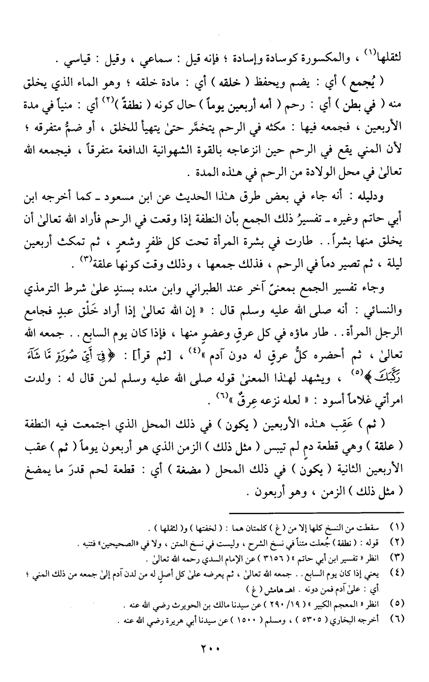 ودليله: أنه جاء في بعض طرق هذا الحديث عن ابن مسعود -كما أخرجه ابن أبي حاتم وغيره- تفسيرُ ذلك الجمع بأن النطفة إذا وقعت في الرحم فأراد اللَّه تعالى أن يخلق منها بشرًا. . طارت في بشرة المرأة تحت كل ظفرٍ وشعرٍ، ثم تمكث أربعين ليلة، ثم تصير دمًا في الرحم، فذلك جمعها، وذلك وقت كونها علقة (¬3).
