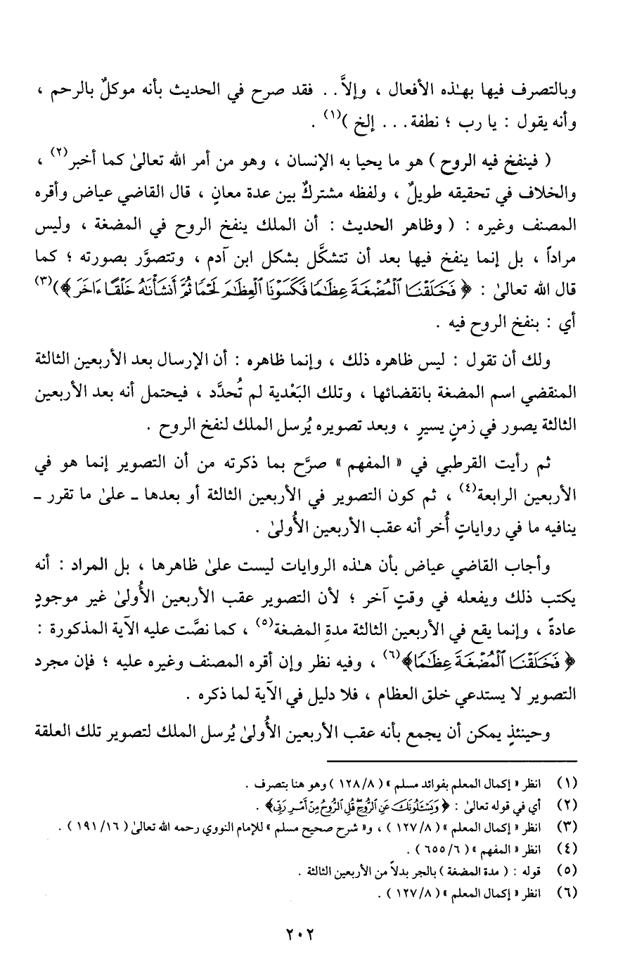 وأجاب القاضي عياض بأن هذه الروايات ليست على ظاهرها، بل المراد: أنه يكتب ذلك ويفعله في وقتٍ آخر؛ لأن التصوير عقب الأربعين الأُولى غير موجودٍ عادةً، وإنَّما يقع في الأربعين الثالثة مدةِ المضغة (¬5)، كما نصَّت عليه الآية المذكورة: {فَخَلَقْنَا الْمُضْغَةَ عِظَامًا} (¬6)، وفيه نظر وإن أقره المصنف وغيره عليه؛ فإنَّ مجرد التصوير لا يستدعي خلق العظام، فلا دليل في الآية لما ذكره.