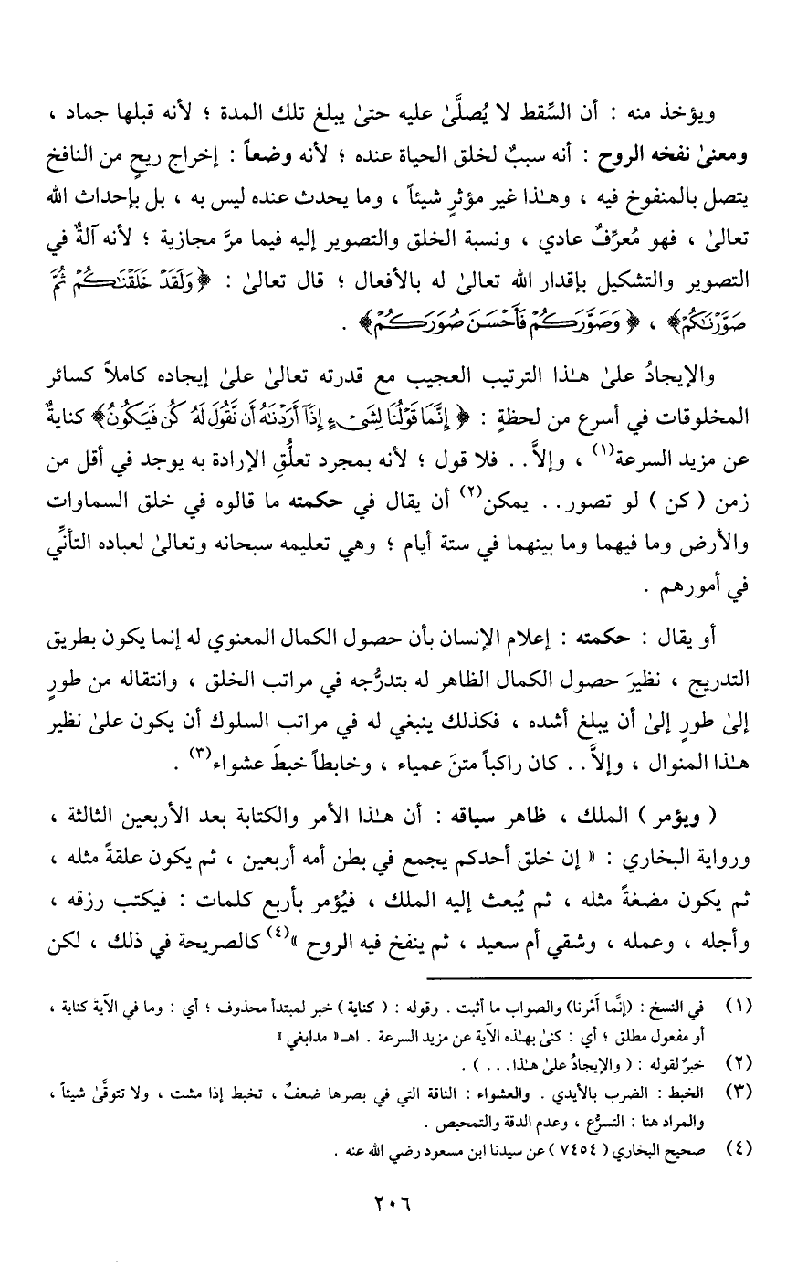 ويؤخذ منه: أن السِّقط لا يُصلَّى عليه حتَّى يبلغ تلك المدة؛ لأنَّه قبلها جماد، ومعنى نفخه الروح: أنه سببٌ لخلق الحياة عنده؛ لأنه وضعًا: إخراج ريحٍ من النافخ يتصل بالمنفوخ فيه، وهذا غير مؤثرٍ شيئًا، وما يحدث عنده ليس به، بل بإحداث اللَّه تعالى، فهو مُعرِّفٌ عادي، ونسبة الخلق والتصوير إليه فيما مرَّ مجازية؛ لأنه آلةٌ في التصوير والتشكيل بإقدار اللَّه تعالى له بالأفعال؛ قال تعالى: {وَلَقَدْ خَلَقْنَاكُمْ ثُمَّ صَوَّرْنَاكُمْ}، {وَصَوَّرَكُمْ فَأَحْسَنَ صُوَرَكُمْ}.