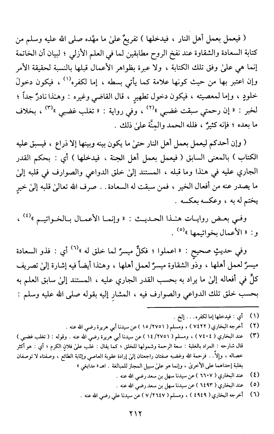 (وإن أحدكم ليعمل بعمل أهل النار حتى ما يكون بينه وبينها إلا ذراع، فيسبق عليه الكتاب) بالمعنى السابق (فيعمل بعمل أهل الجنة، فيدخلها) أي: بحكم القدر الجاري عليه في هذا وما قبله، المستند إلى خلق الدواعي والصوارف في قلبه إلى ما يصدر عنه من أفعال الخير، فمن سبقت له السعادة. . صرف اللَّه تعالى قلبه إلى خيرِ يختم له به، وعكسه بعكسه.