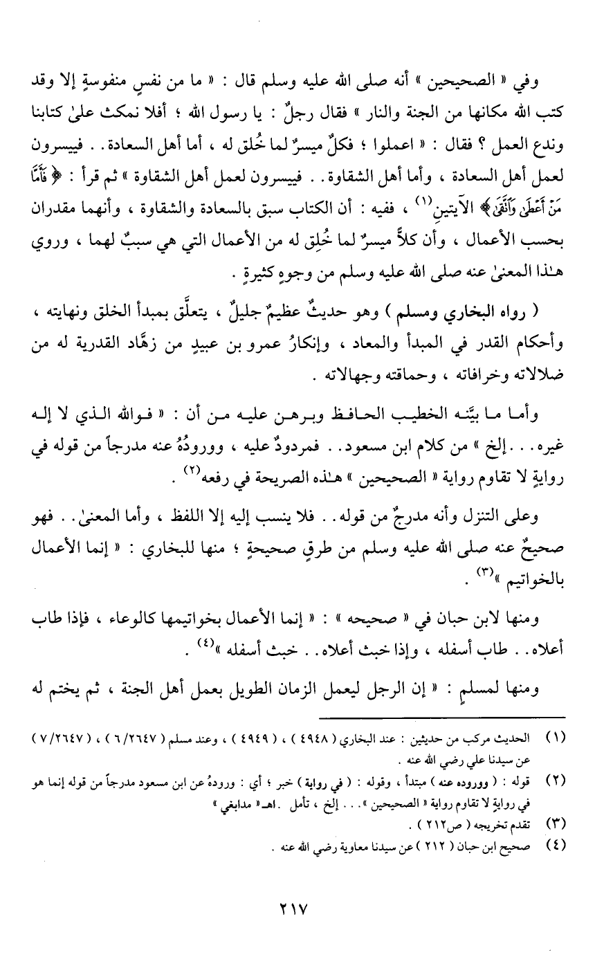 (رواه البخاري ومسلم) وهو حديثٌ عظيمٌ جليلٌ، يتعلَّق بمبدأ الخلق ونهايته، وأحكام القدر في المبدأ والمعاد، وإنكارُ عمرو بن عبيدٍ من زهَّاد القدرية له من ضلالاته وخرافاته، وحماقته وجهالاته.