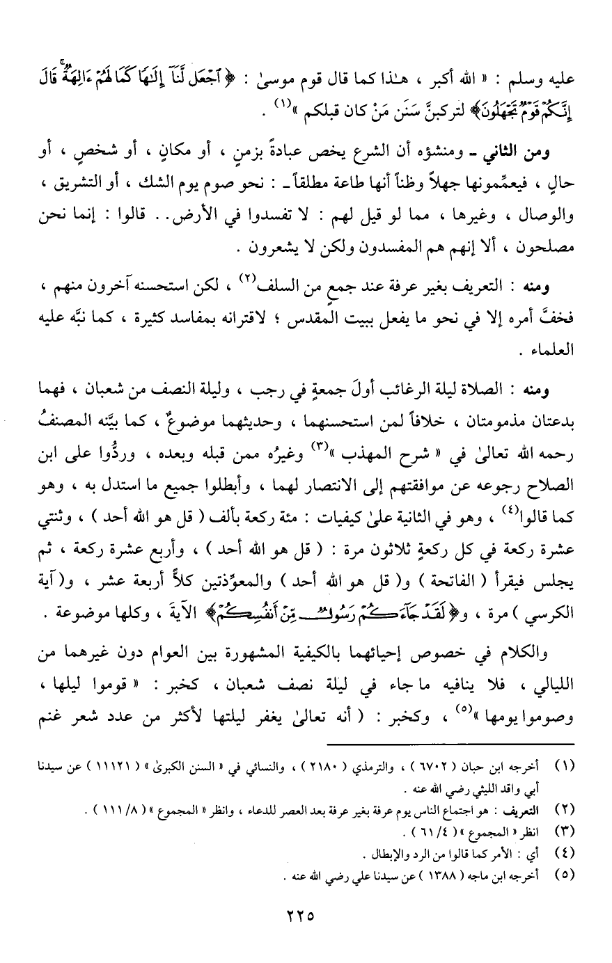 ومنه: الصلاة ليلة الرغائب أولَ جمعةٍ في رجب، وليلة النصف من شعبان، فهما بدعتان مذمومتان، خلافًا لمن استحسنهما، وحديثهما موضوعٌ، كما بيَّنه المصنفُ رحمه اللَّه تعالى في "شرح المهذب" (¬3) وغيرُه ممن قبله وبعده، وردُّوا على ابن الصلاح رجوعه عن موافقتهم إلى الانتصار لهما، وأبطلوا جميع ما استدل به، وهو كما قالوا (¬4)، وهو في الثَّانية على كيفيات: مئة ركعة بألف {قُلْ هُوَ اللَّهُ أَحَدٌ}، وثنتي عشرة ركعة في كل ركعةٍ ثلاثون مرة: {قُلْ هُوَ اللَّهُ أَحَدٌ}، وأربع عشرة ركعة، ثم يجلس فيقرأ (الفاتحة) و {قُلْ هُوَ اللَّهُ أَحَدٌ} والمعوّذتين كلًّا أربعة عشر، و (آية الكرسي) مرة، و {لَقَدْ جَاءَكُمْ رَسُولٌ مِنْ أَنْفُسِكُمْ} الآيةَ، وكلها موضوعة.
