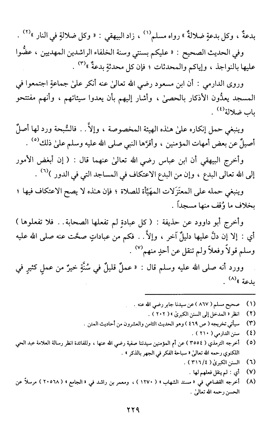 وروى الدارمي: أن ابن مسعود رضي اللَّه تعالى عنه أنكر على جماعةٍ اجتمعوا في المسجد يعدُّون الأذكار بالحصى، وأشار إليهم بأن يعدوا سيئاتهم، وأنهم مفتتحو باب ضلالة (¬4).
