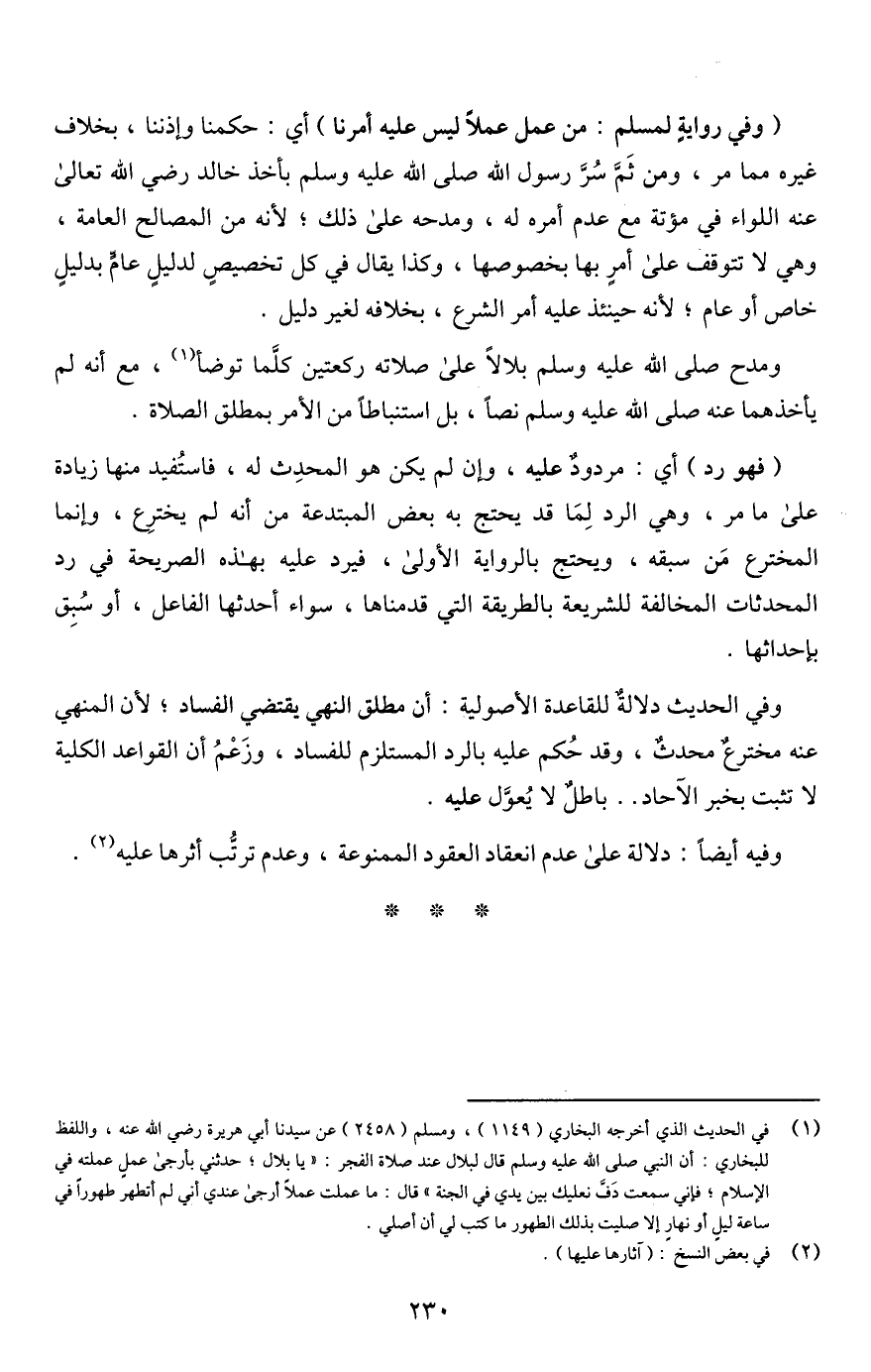 وفي الحديث دلالةٌ للقاعدة الأصولية: أن مطلق النهي يقتضي الفساد؛ لأن المنهي عنه مخترعٌ محدثٌ، وقد حُكم عليه بالرد المستلزم للفساد، وزَعْمُ أن القواعد الكلية لا تثبت بخبر الآحاد. . باطلٌ لا يُعوَّل عليه.