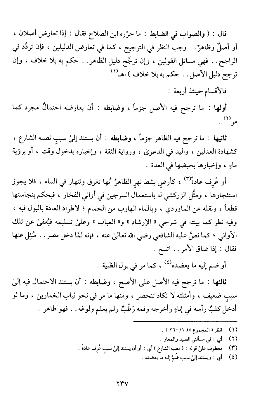 قال: (والصواب في الضابط: ما حرَّره ابن الصلاح فقال: إذا تعارض أصلان، أو أصلٌ وظاهرٌ. . وجب النظر في الترجيح، كما في تعارض الدليلين، فإن تردَّد في الراجح. . فهي مسائل القولين، وإن ترجَّح دليل الظاهر. . حكم به بلا خلاف، وإن ترجح دليل الأصل. . حكم به بلا خلاف) اهـ (¬1)