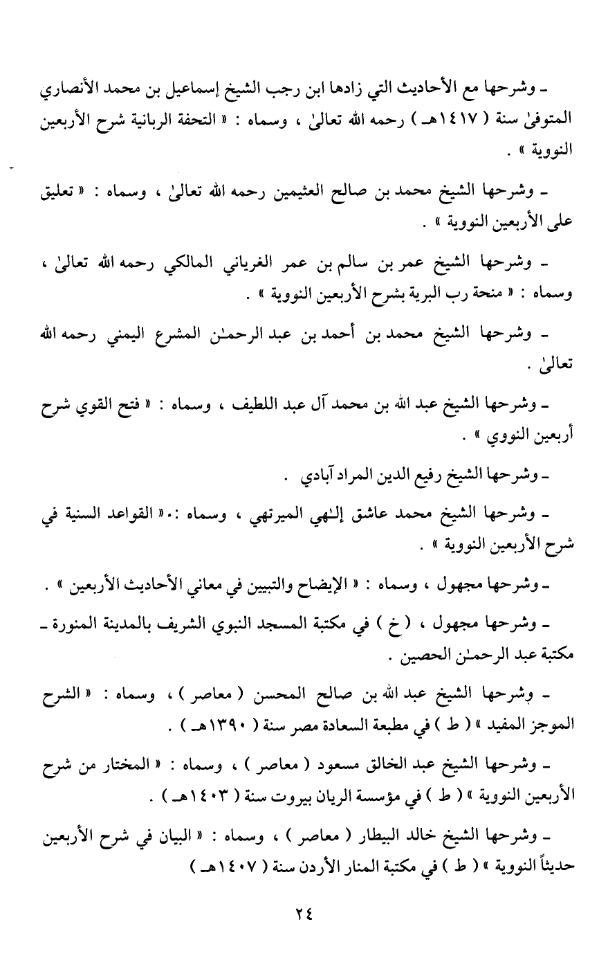 - وشرحها مع الأحاديث التي زادها ابن رجب الشيخ إسماعيل بن محمد الأنصاري المتوفى سنة (1417 هـ) رحمه اللَّه تعالى، وسماه: "التحفة الربانية شرح الأربعين النووية".