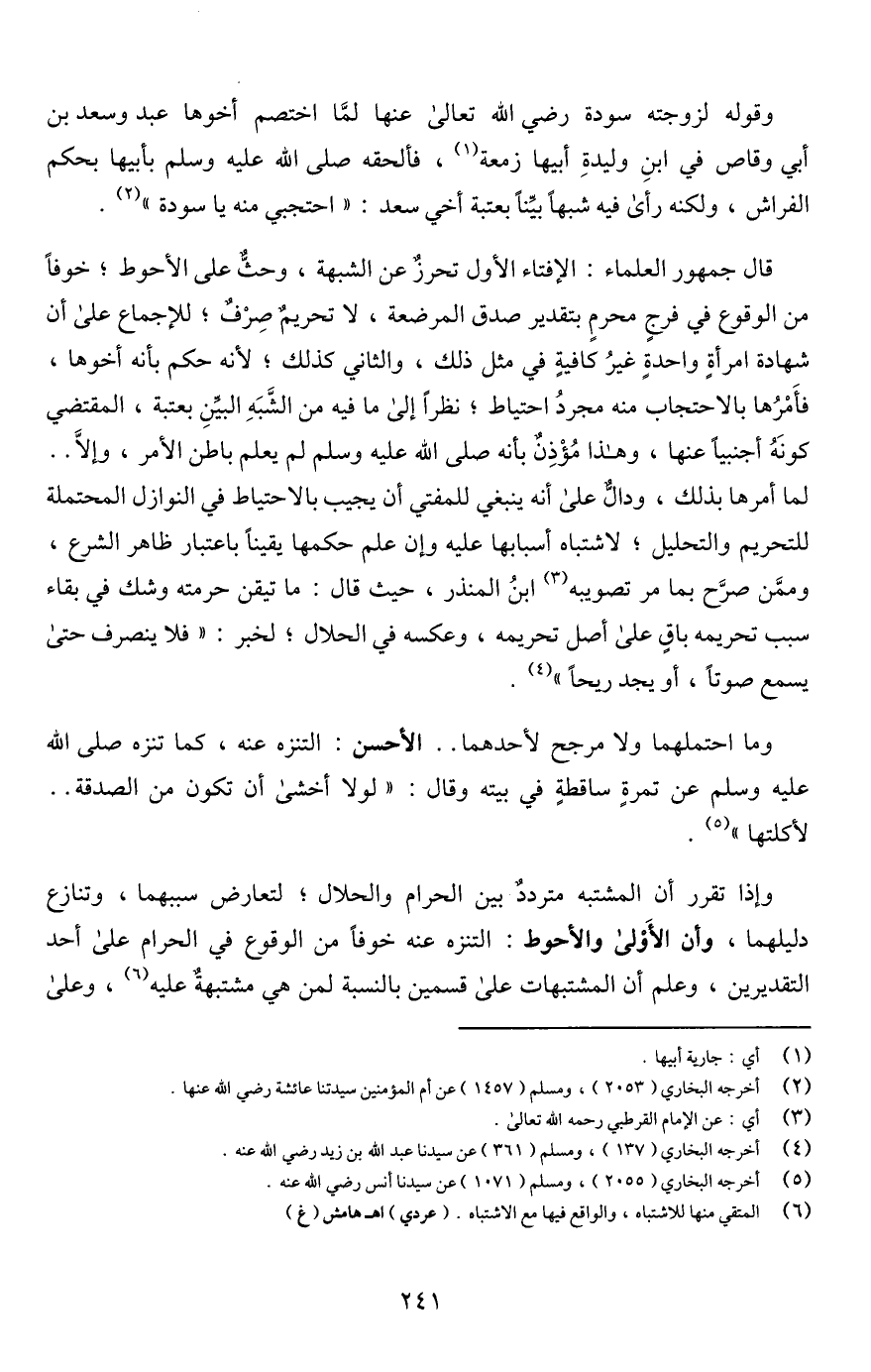 قال جمهور العلماء: الإفتاء الأول تحرزٌ عن الشبهة، وحثٌّ على الأحوط؛ خوفًا من الوقوع في فرجٍ محرمٍ بتقدير صدق المرضعة، لا تحريمٌ صِرْفٌ؛ للإجماع على أن شهادة امرأةٍ واحدةٍ غيرُ كافيةٍ في مثل ذلك، والثاني كذلك؛ لأنه حكم بأنه أخوها، فأَمْرُها بالاحتجاب منه مجردُ احتياط؛ نظرًا إلى ما فيه من الشَّبَهِ البيِّنِ بعتبة، المقتضي كونَهُ أجنبيًا عنها، وهذا مُؤْذِنٌ بأنه صلى اللَّه عليه وسلم لم يعلم باطن الأمر، وإلَّا. . لما أمرها بذلك، ودالٌّ على أنه ينبغي للمفتي أن يجيب بالاحتياط في النوازل المحتملة للتحريم والتحليل؛ لاشتباه أسبابها عليه وإن علم حكمها يقينًا باعتبار ظاهر الشرع، وممَّن صرَّح بما مر تصويبه (¬3) ابنُ المنذر، حيث قال: ما تيقن حرمته وشك في بقاء سبب تحريمه باقٍ على أصل تحريمه، وعكسه في الحلال؛ لخبر: "فلا ينصرف حتى يسمع صوتًا، أو يجد ريحًا" (¬4).