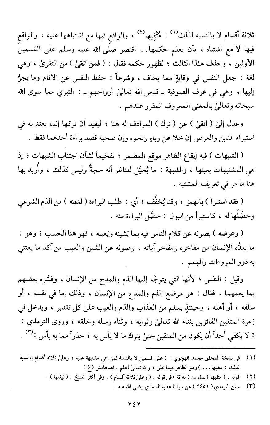 ثلاثة أقسام لا بالنسبة لذلك (¬1): مُتَّقِيها (¬2)، والواقعِ فيها مع اشتباهها عليه، والواقعِ فيها لا مع اشتباه، بأن يعلم حكمها. . اقتصر صلى اللَّه عليه وسلم على القسمين الأولين، وحذف هذا الثالث؛ لظهور حكمه فقال: (فمن اتقى) من التقوى، وهي لغة: جعل النفس في وقايةٍ مما يخاف، وشرعًا: حفظ النفس عن الآثام وما يجرُّ إليها، وهي في عرف الصوفية -قدس اللَّه تعالى أرواحهم-: التبري مما سوى اللَّه سبحانه وتعالى بالمعنى المعروف المقرر عندهم.