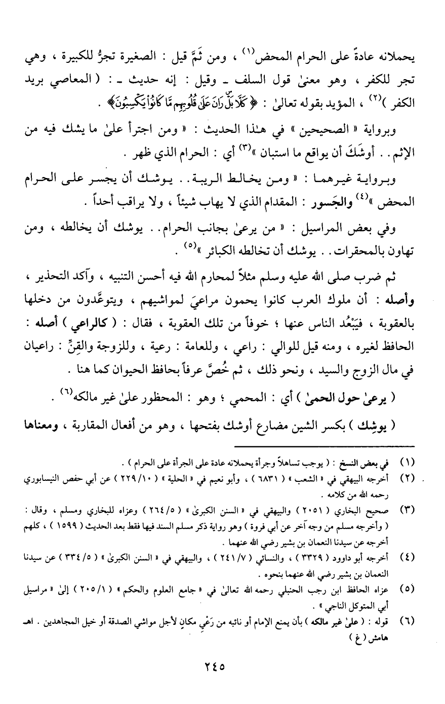 وفي بعض المراسيل: "من يرعى بجانب الحرام. . يوشك أن يخالطه، ومن تهاون بالمحقرات. . يوشك أن تخالطه الكبائر" (¬5).