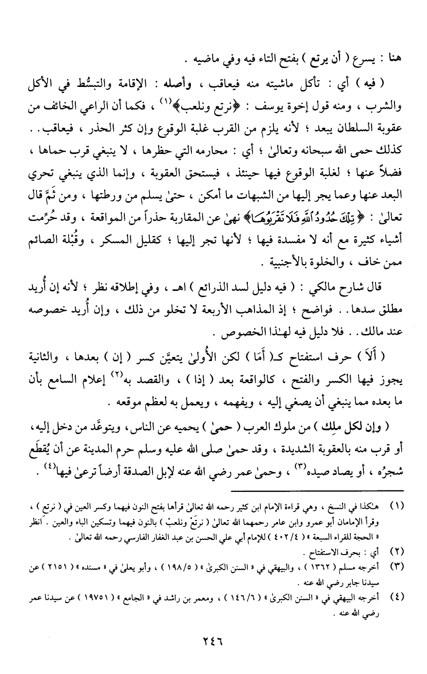 "فيه" أي: تأكل ماشيته منه فيعاقب، وأصله: الإقامة والتبسُّط في الأكل والشرب، ومنه قول إخوة يوسف: {نرتع ونلعب} (¬1)، فكما أن الراعي الخائف من عقوبة السلطان يبعد؛ لأنه يلزم من القرب غلبة الوقوع وإن أكثر الحذر، فيعاقب. . كذلك حمى اللَّه سبحانه وتعالى، أي: محارمه التي حظرها، لا ينبغي قرب حماها، فضلًا عنها؛ لغلبة الوقوع فيها حينئذ، فيستحق العقوبة، وإنما الذي ينبغي تحري البعد عنها وعما يجر إليها من الشبهات ما أمكن، حتى يسلم من ورطتها، ومن ثَمَّ قال تعالى: {تِلْكَ حُدُودُ اللَّهِ فَلَا تَقْرَبُوهَا} نهى عن المقاربة حذرًا من المواقعة، وقد حُرِّمت أشياء كثيرة مع أنه لا مفسدة فيها؛ لأنها تجر إليها؛ كقليل المسكر، وقُبْلة الصائم ممن خاف، والخلوة بالأجنبية.