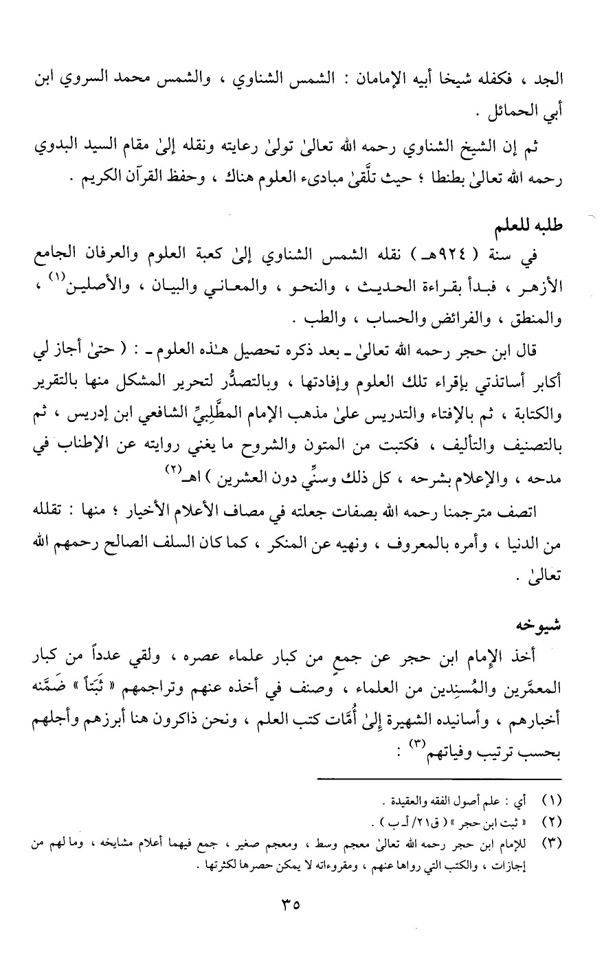 قال ابن حجر رحمه اللَّه تعالى -بعد ذكره تحصيل هذه العلوم-: (حتى أجاز لي أكابر أساتذتي بإقراء تلك العلوم وإفادتها، وبالتصدُّر لتحرير المشكل منها بالتقرير والكتابة، ثم بالإفتاء والتدريس على مذهب الإمام المطَّلِبيِّ الشافعي ابن إدريس، ثم بالتصنيف والتأليف، فكتبت من المتون والشروح ما يغني روايته عن الإطناب في مدحه، والإعلام بشرحه، كل ذلك وسنِّي دون العشرين) اهـ (¬2)