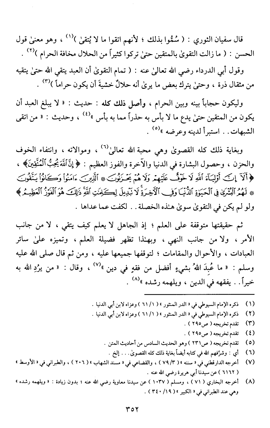 وقول أبي الدرداء رضي اللَّه تعالى عنه: (تمام التقوى أن العبد يتقي اللَّه حتى يتقيه من مثقال ذرة، وحتى يترك بعض ما يرى أنه حلالٌ خشيةَ أن يكون حرامًا) (¬3).