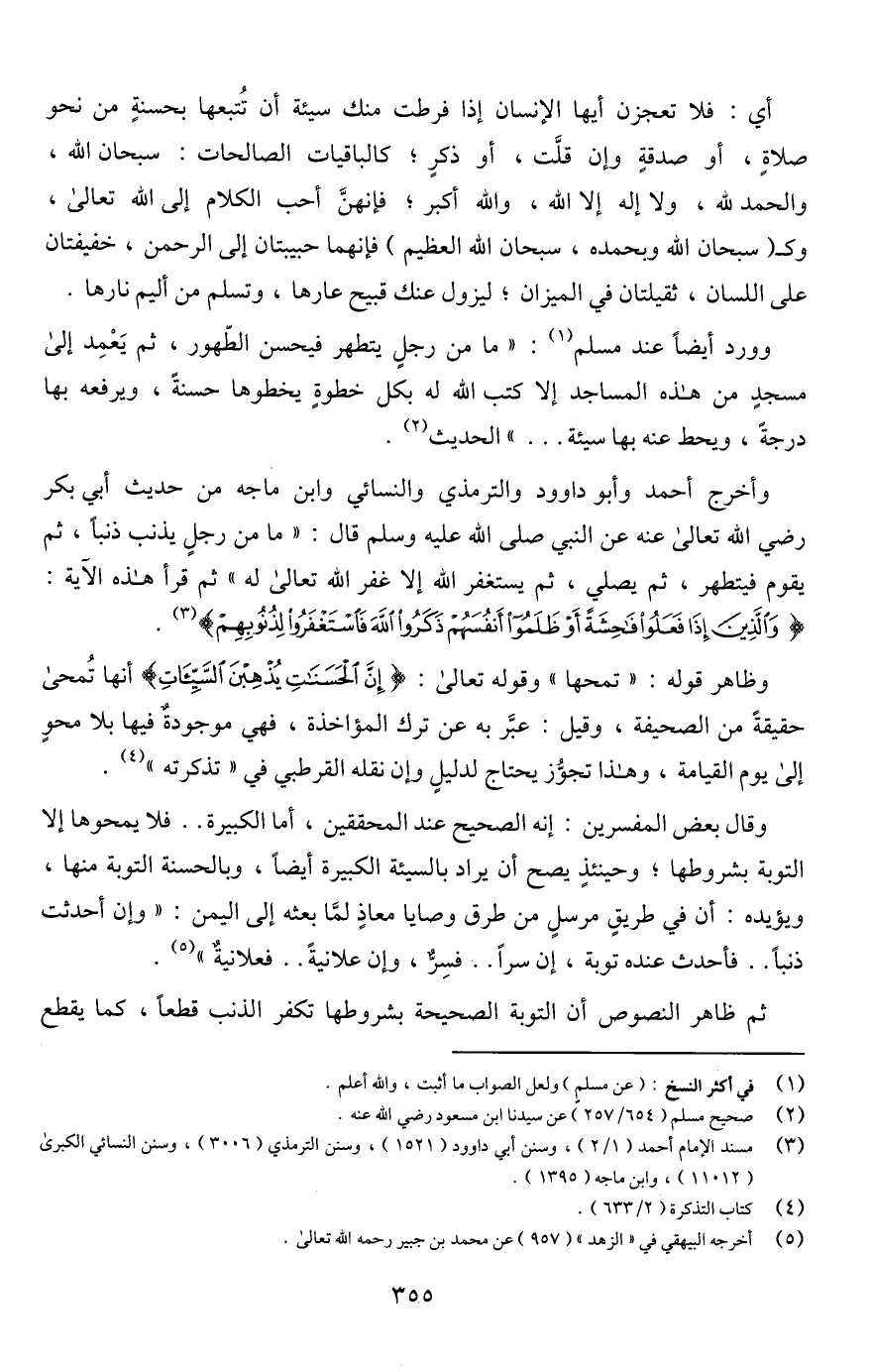 وأخرج أحمد وأبو داوود والترمذي والنسائي وابن ماجه من حديث أبي بكر رضي اللَّه تعالى عنه عن النبي صلى اللَّه عليه وسلم قال: "ما من رجلٍ يذنب ذنبًا، ثم يقوم فيتطهر، ثم يصلي، ثم يستغفر اللَّه إلا غفر اللَّه تعالى له" ثم قرأ هذه الآية: {وَالَّذِينَ إِذَا فَعَلُوا فَاحِشَةً أَوْ ظَلَمُوا أَنْفُسَهُمْ ذَكَرُوا اللَّهَ فَاسْتَغْفَرُوا لِذُنُوبِهِمْ} (¬3).