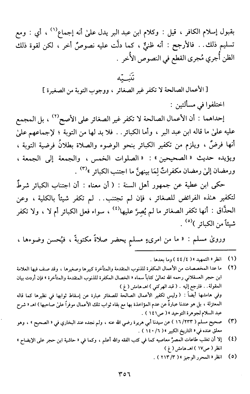 وفي هامشها أيضًا: (وليس تكفير الأعمال الصالحة للصغائر عبارة عن إسقاط ثوابها في نظيرها كما قاله المعتزلة، بل هو عندنا عبارةٌ عن عدم المؤاخذة بها مع بقاء ثواب تلك الأعمال موفرًا على صاحبها) اهـ "شرح عبد السلام لجوهرة التوحيد" (ص 141).