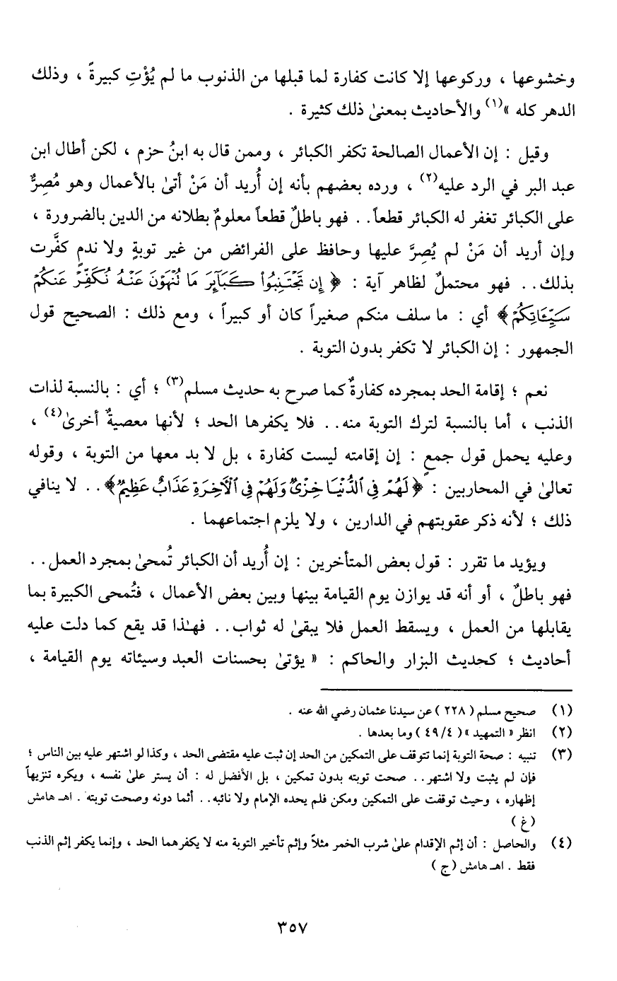 وقيل: إن الأعمال الصالحة تكفر الكبائر، وممن قال به ابنُ حزم، لكن أطال ابن عبد البر في الرد عليه (¬2)، ورده بعضهم بأنه إن أُريد أن مَنْ أتى بالأعمال وهو مُصِرٌّ على الكبائر تغفر له الكبائر قطعًا. . فهو باطلٌ قطعًا معلومٌ بطلانه من الدين بالضرورة، وإن أريد أن مَنْ لم يُصِرَّ عليها وحافظ على الفرائض من غير توبةٍ ولا ندمٍ كفَّرت بذلك. . فهو محتملٌ لظاهر آية: {إِنْ تَجْتَنِبُوا كَبَائِرَ مَا تُنْهَوْنَ عَنْهُ نُكَفِّرْ عَنْكُمْ سَيِّئَاتِكُمْ} أي: ما سلف منكم صغيرًا كان أو كبيرًا، ومع ذلك: الصحيح قول الجمهور: إن الكبائر لا تكفر بدون التوبة.