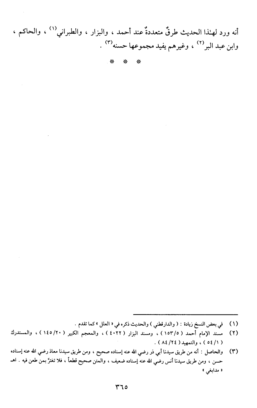 (¬3) والحاصل: أنه من طريق سيدنا أبي ذر رضي اللَّه عنه إسناده صحيح، ومن طريق سيدنا معاذ رضي اللَّه عنه إسناده حسن، ومن طريق سيدنا أنس رضي اللَّه عنه إسناده ضعيف، والمتن صحيح قطعًا، فلا نغترَّ بمن طعن فيه. اهـ "مدابغي"