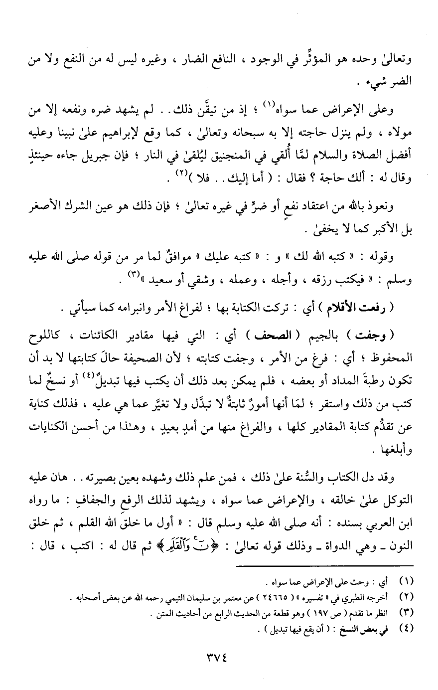وقد دل الكتاب والسُّنة على ذلك، فمن علم ذلك وشهده بعين بصيرته. . هان عليه التوكل على خالقه، والإعراض عما سواه، ويشهد لذلك الرفعِ والجفافِ: ما رواه ابن العربي بسنده: أنه صلى اللَّه عليه وسلم قال: "أول ما خلق اللَّه القلم، ثم خلق النون -وهي الدواة- وذلك قوله تعالى: {ن وَالْقَلَمِ} ثم قال له: اكتب، قال: