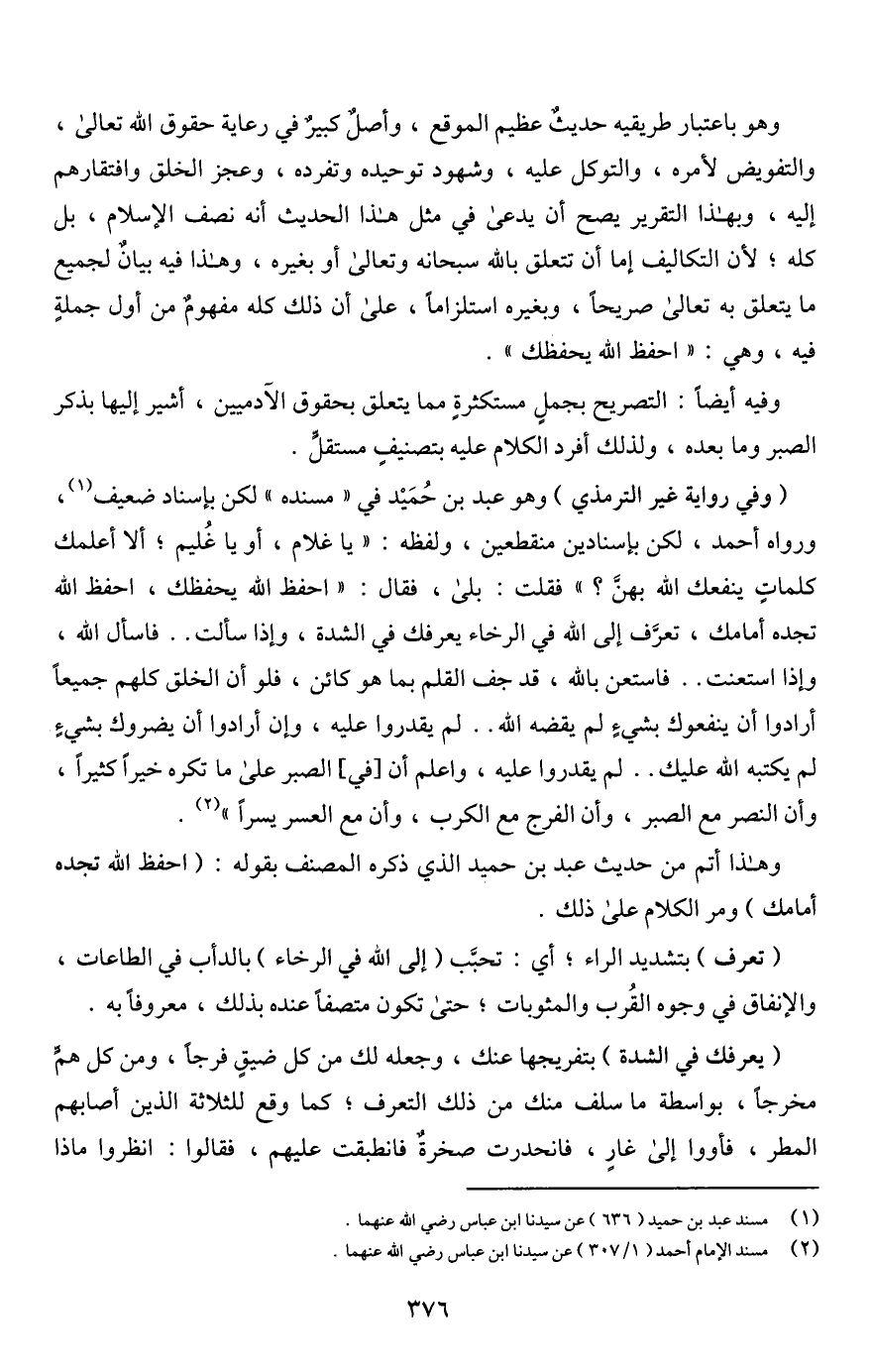 وهو باعتبار طريقيه حديثٌ عظيم الموقع، وأصلٌ كبيرٌ في رعاية حقوق اللَّه تعالى، والتفويض لأمره، والتوكل عليه، وشهود توحيده وتفرده، وعجز الخلق وافتقارهم إليه، وبهذا التقرير يصح أن يدعى في مثل هذا الحديث أنه نصف الإسلام، بل كله؛ لأن التكاليف إما أن تتعلق باللَّه سبحانه وتعالى أو بغيره، وهذا فيه بيانٌ لجميع ما يتعلق به تعالى صريحًا، وبغيره استلزامًا، على أن ذلك كله مفهومٌ من أول جملةٍ فيه، وهي: "احفظ اللَّه يحفظك".