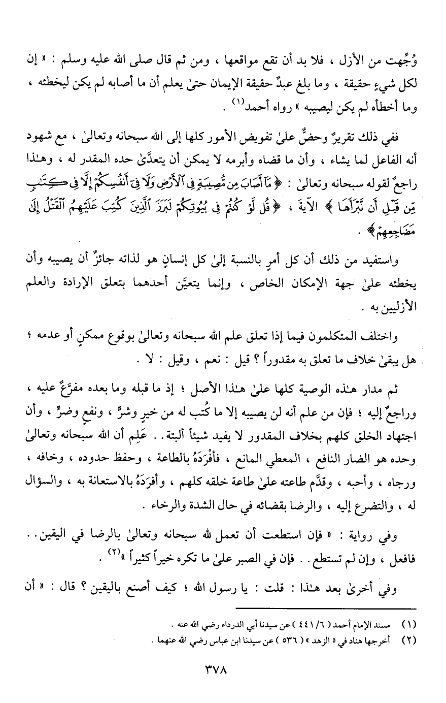 واستفيد من ذلك أن كل أمرٍ بالنسبة إلى كل إنسانٍ هو لذاته جائزٌ أن يصيبه وأن يخطئه على جهة الإمكان الخاص، وإنما يتعيَّن أحدهما بتعلق الإرادة والعلم الأزليين به.