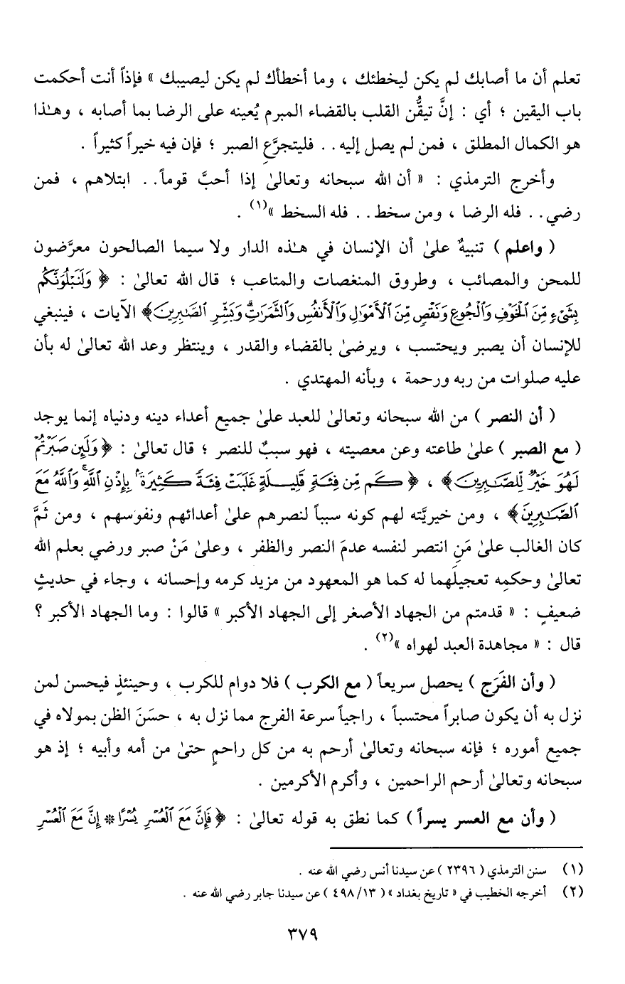 تعلم أن ما أصابك لم يكن ليخطئك، وما أخطأك لم يكن ليصيبك" فإذا أنت أحكمت باب اليقين؛ أي: إنَّ تيقُّن القلب بالقضاء المبرم يُعينه على الرضا بما أصابه، وهذا هو الكمال المطلق، فمن لم يصل إليه. . فليتجرَّعِ الصبر؛ فإن فيه خيرًا كثيرًا.