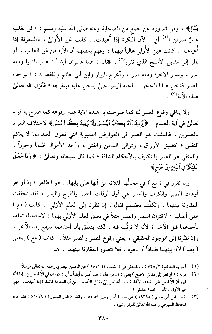 وما تقرر في (مع) في محالِّها الثلاثة من أنها على بابها. . هو الظاهر؛ إذ أواخر أوقات الصبر والكرب والعسر هي أول أوقات النصر والفرج واليسر، فقد تحققت المقارنة بينهما، وتكلَّف بعضهم فقال: إن نظرنا إلى العلم الأزلي. . كانت (مع) على أصلها؛ لاقتران النصر والصبر مثلًا في تعلُّق العلم الأزلي بهما؛ لاستحالة تعلقه بأحدهما قبل الآخر؛ لأنه لا ترتُّب فيه، لكنه يتعلق بان أحدهما سيقع بعد الآخر، وإن نظرنا إلى الوجود الحقيقي؛ يعني وقوع النصر والصبر مثلًا. . كانت (مع) بمعنى (بعد) لأن بينهما تضادًا أو نحوه، فلا تتصور المقارنة بينهما. اهـ