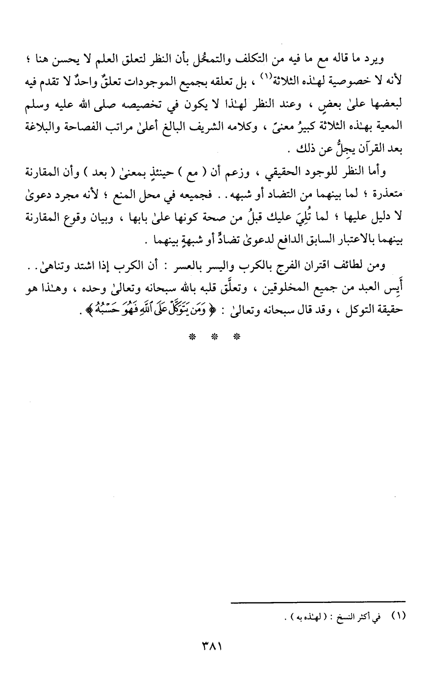 ويرد ما قاله مع ما فيه من التكلف والتمحُّل بأن النظر لتعلق العلم لا يحسن هنا؛ لأنه لا خصوصية لهذه الثلاثة (¬1)، بل تعلقه بجميع الموجودات تعلقٌ واحدٌ لا تقدم فيه لبعضها على بعضٍ، وعند النظر لهذا لا يكون في تخصيصه صلى اللَّه عليه وسلم المعية بهذه الثلاثة كبيرُ معنًى، وكلامه الشريف البالغ أعلى مراتب الفصاحة والبلاغة بعد القرآن يجِلُّ عن ذلك.