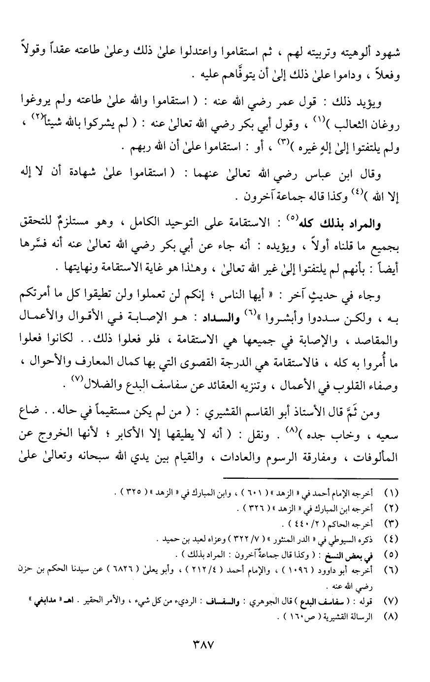 ومن ثَمَّ قال الأستاذ أبو القاسم القشيري: (من لم يكن مستقيمًا في حاله. . ضاع سعيه، وخاب جده) (¬8). ونقل: (أنه لا يطيقها إلا الأكابر؛ لأنها الخروج عن المألوفات، ومفارقة الرسوم والعادات، والقيام بين يدي اللَّه سبحانه وتعالى على