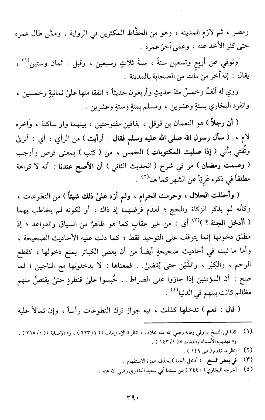 (وأحللت الحلال، وحرمت الحرام، ولم أزد على ذلك شيئًا) من التطوعات، وكأنه لم يذكر الزكاة والحج؛ لعدم فرضهما إذ ذاك، أو لكونه لم يخاطب بهما (أأدخل الجنة؟) (¬3) أي: من غير عقابٍ كما هو ظاهرٌ من السياق والقواعد، إذ مطلق دخولها إنما يتوقف على التوحيد فقط؛ كما دلت عليه الأحاديث الصحيحة، وأما ما ثبت في أحاديث صحيحةٍ أيضًا من أن بعض الكبائر يمنع دخولها، كقطع الرحم، والكِبْر، والدَّيْن حتى يُقضى. . فمعناها: لا يدخلونها مع الناجين؛ لما صح: أن المؤمنين إذا جازوا على الصراط. . حُبسوا على قنطرةٍ حتى يقتصَّ منهم مظالم كانت بينهم في الدنيا (¬4).