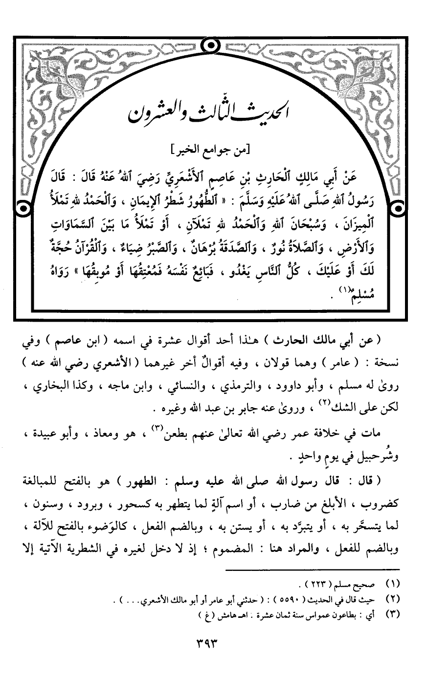 عَنْ أَبِي مَالِكٍ الْحَارِثِ بْنِ عَاصِمٍ الأَشْعَرِيِّ رَضِيَ اللَّهُ عَنْهُ قَالَ: قَالَ رَسُولُ اللَّهِ صَلَّى اللَّهُ عَلَيْهِ وَسَلَّمَ: "الطُّهُورُ شَطْرُ الإِيمَانِ، وَالْحَمْدُ للَّهِ تَمْلَأُ الْمِيزَانَ، وَسُبْحَانَ اللَّهِ وَالْحَمْدُ للَّهِ تَمْلَآنِ، أَوْ تَمْلَأُ مَا بَيْنَ السَّمَاوَاتِ وَالأَرْضِ، وَالصَّلَاةُ نُورٌ، وَالصَّدَقَةُ بُرْهَانٌ، وَالصَّبْرُ ضِيَاءٌ، وَالْقُرْآنُ حُجَّةٌ لَكَ أَوْ عَلَيْكَ، كُلُّ النَّاسِ يَغْدُو، فَبَائِعٌ نَفْسَهُ فَمُعْتِقُهَا أَوْ مُوبقُهَا" رَوَاهُ مُسْلِمٌ (¬1).