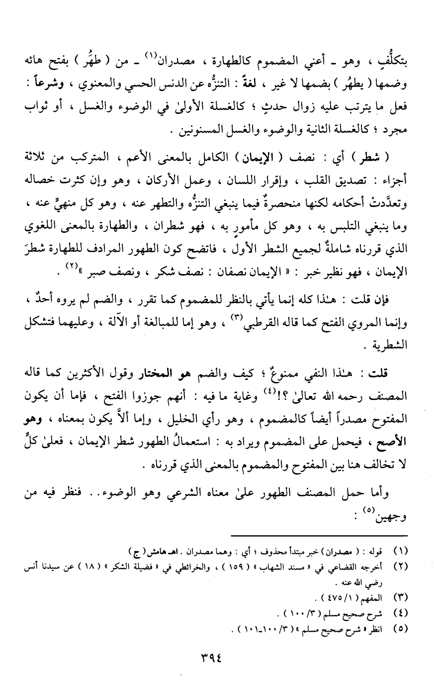 قلت: هذا النفي ممنوعٌ؛ كيف والضم هو المختار وقول الأكثرين كما قاله المصنف رحمه اللَّه تعالى؟! (¬4) وغاية ما فيه: أنهم جوزوا الفتح، فإما أن يكون المفتوح مصدرًا أيضًا كالمضموم، وهو رأي الخليل، وإما ألَّا يكون بمعناه، وهو الأصح، فيحمل على المضموم ويراد به: استعمالُ الطهور شطر الإيمان، فعلى كلٍّ لا تخالف هنا بين المفتوح والمضموم بالمعنى الذي قررناه.