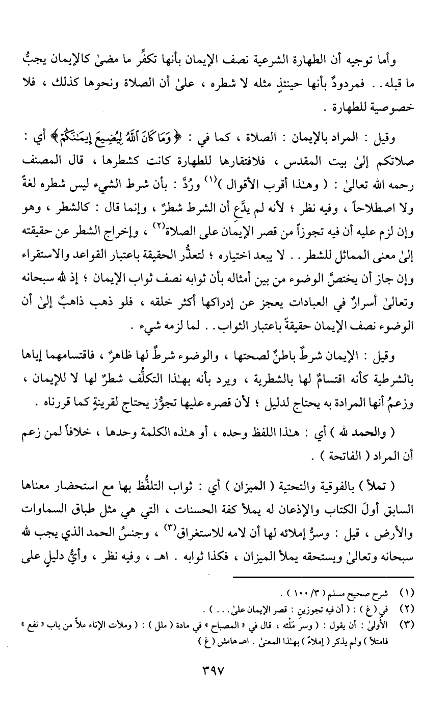 وقيل: المراد بالإيمان: الصلاة، كما في: {وَمَا كَانَ اللَّهُ لِيُضِيعَ إِيمَانَكُمْ} أي: صلاتكم إلى بيت المقدس، فلافتقارها للطهارة كانت كشطرها، قال المصنف رحمه اللَّه تعالى: (وهذا أقرب الأقوال) (¬1) ورُدَّ: بأن شرط الشيء ليس شطره لغةً ولا اصطلاحًا، وفيه نظر؛ لأنه لم يدَّعِ أن الشرط شطرٌ، وإنما قال: كالشطر، وهو وإن لزم عليه أن فيه تجوزًا من قصر الإيمان على الصلاة (¬2)، وإخراج الشطر عن حقيقته إلى معنى المماثل للشطر. . لا يبعد اختياره؛ لتعذُّر الحقيقة باعتبار القواعد والاستقراء وإن جاز أن يختصَّ الوضوء من بين أمثاله بأن ثوابه نصف ثواب الإيمان؛ إذ للَّه سبحانه وتعالى أسرارٌ في العبادات يعجز عن إدراكها أكثر خلقه، فلو ذهب ذاهبٌ إلى أن الوضوء نصف الإيمان حقيقةً باعتبار الثواب. . لما لزمه شيء.