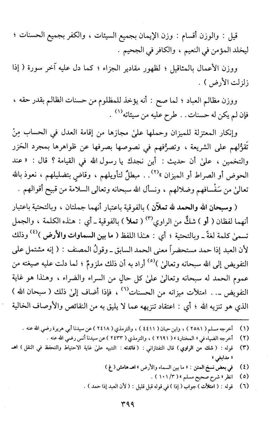 وإنكار المعتزلة للميزان وحملها على مجازها من إقامة العدل في الحساب مِنْ تَقوُّلهم على الشريعة، وتصرُّفهم في نصوصها بصرفها عن ظواهرها بمجرد الحَزر والتخمين، على أن حديث: أين نجدك يا رسول اللَّه في القيامة؟ قال: "عند الحوض أو الصراط أو الميزان" (¬2). . مبطلٌ لتأويلهم، وقاضٍ بتضليلهم، نعوذ باللَّه تعالى من سَفْسافهم وضلالهم، ونسأل اللَّه سبحانه وتعالى السلامة من قبيح أقوالهم.