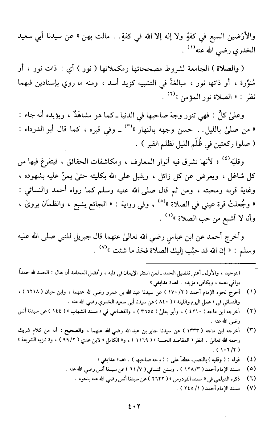 (والصلاة) الجامعة لشروط مصححاتها ومكملاتها (نور) أي: ذات نور، أو مُنوِّرة، أو ذاتها نور، مبالغةً في التشبيه كزيد أسد، ومنه ما روي بإسنادين فيهما نظر: "الصلاة نور المؤمن" (¬2).