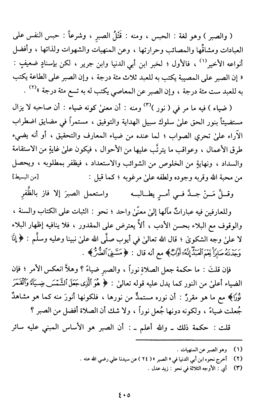 وللعارفين فيه عباراتٌ مآلها إلى معنًى واحد؛ نحو: الثبات على الكتاب والسنة، والوقوف مع البلاء بحسن الأدب، ألَّا يعترض على المقدور، فلا ينافيه إظهار البلاء لا على وجه الشكوى؛ قال اللَّه تعالى في أيوب صلَّى اللَّه على نبينا وعليه وسلَّم: {إِنَّا وَجَدْنَاهُ صَابِرًا نِعْمَ الْعَبْدُ إِنَّهُ أَوَّابٌ} مع أنه قال: {مَسَّنِيَ الضُّرُّ}.