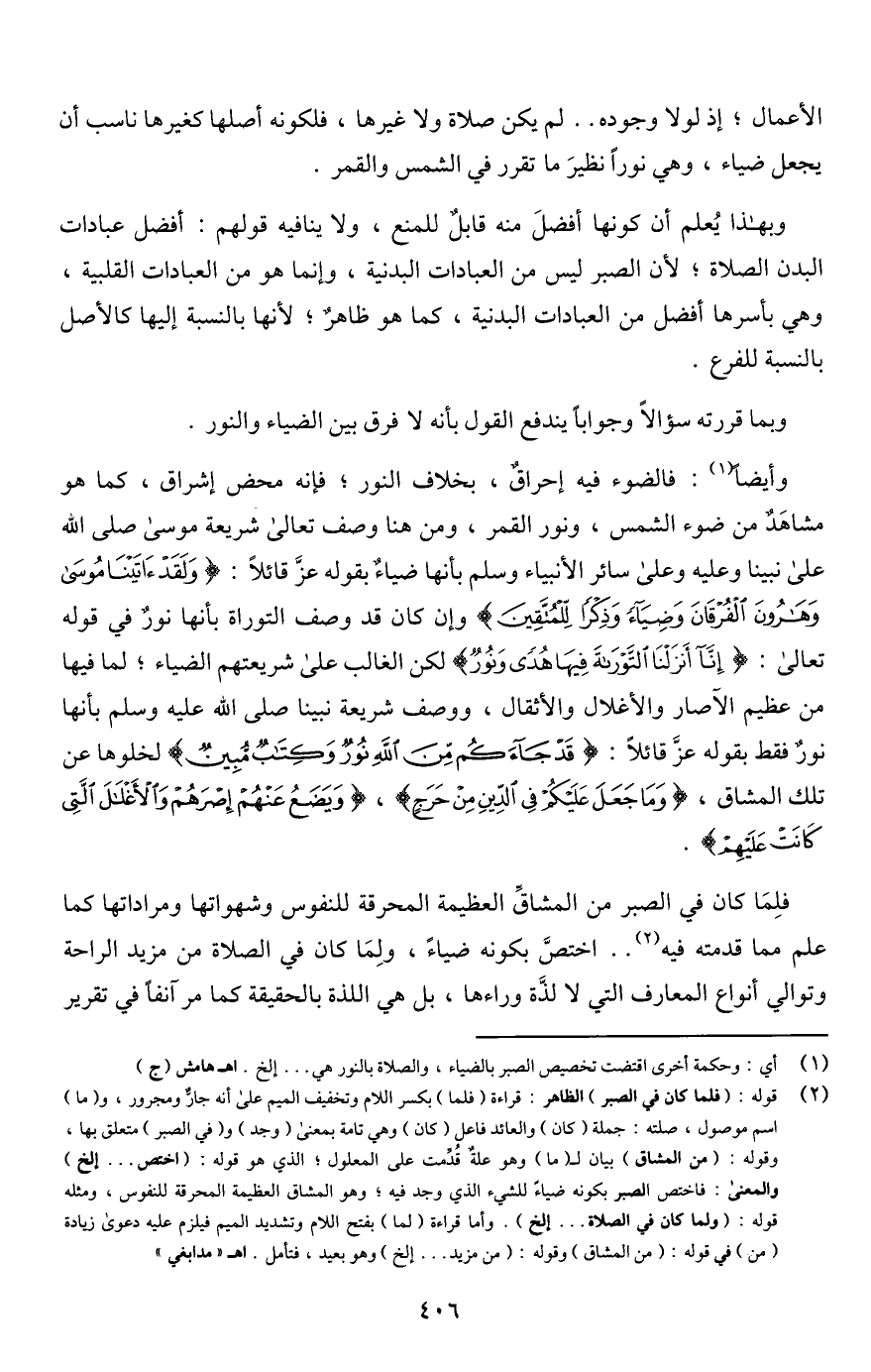 (¬2) قوله: (فلما كان في الصبر) الظاهر: قراءة (فلما) بكسر اللام وتخفيف الميم على أنه جارٌّ ومجرور، و (ما) اسم موصول، صلته: جملة (كان) والعائد فاعل (كان) وهي تامة بمعنى (وجد) و (في الصبر) متعلق بها، وقوله: (من المشاق) بيان لـ (ما) وهو علةٌ قُدِّمت على المعلول؛ الذي هو قوله: (اختص. . . إلخ) والمعنى: فاختص الصبر بكونه ضياءً للشيء الذي وجد فيه؛ وهو المشاق العظيمة المحرقة للنفوس، ومئله قوله: (ولما كان في الصلاة. . . إلخ). وأما قراءة (لما) بفتح اللام وتشديد الميم فيلزم عليه دعوى زيادة (من) في قوله: (من المشاق) وقوله: (من مزيد. . . إلخ) وهو بعيد، فتأمل. اهـ "مدابغي"