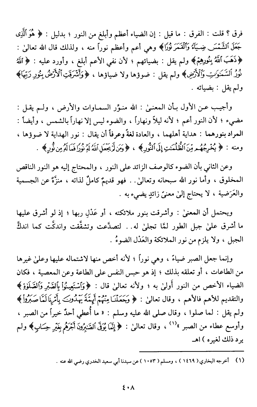 وعن الثاني بأن الضوء كالوصف الزائد على النور، والمحتاج إليه هو النور الناقص المخلوق، وأما نور اللَّه سبحانه وتعالى. . فهو قديمٌ كاملٌ لذاته، منزَّهٌ عن الجسمية والعَرَضية، لا يحتاج إلى معنًى زائدٍ يضيء به.