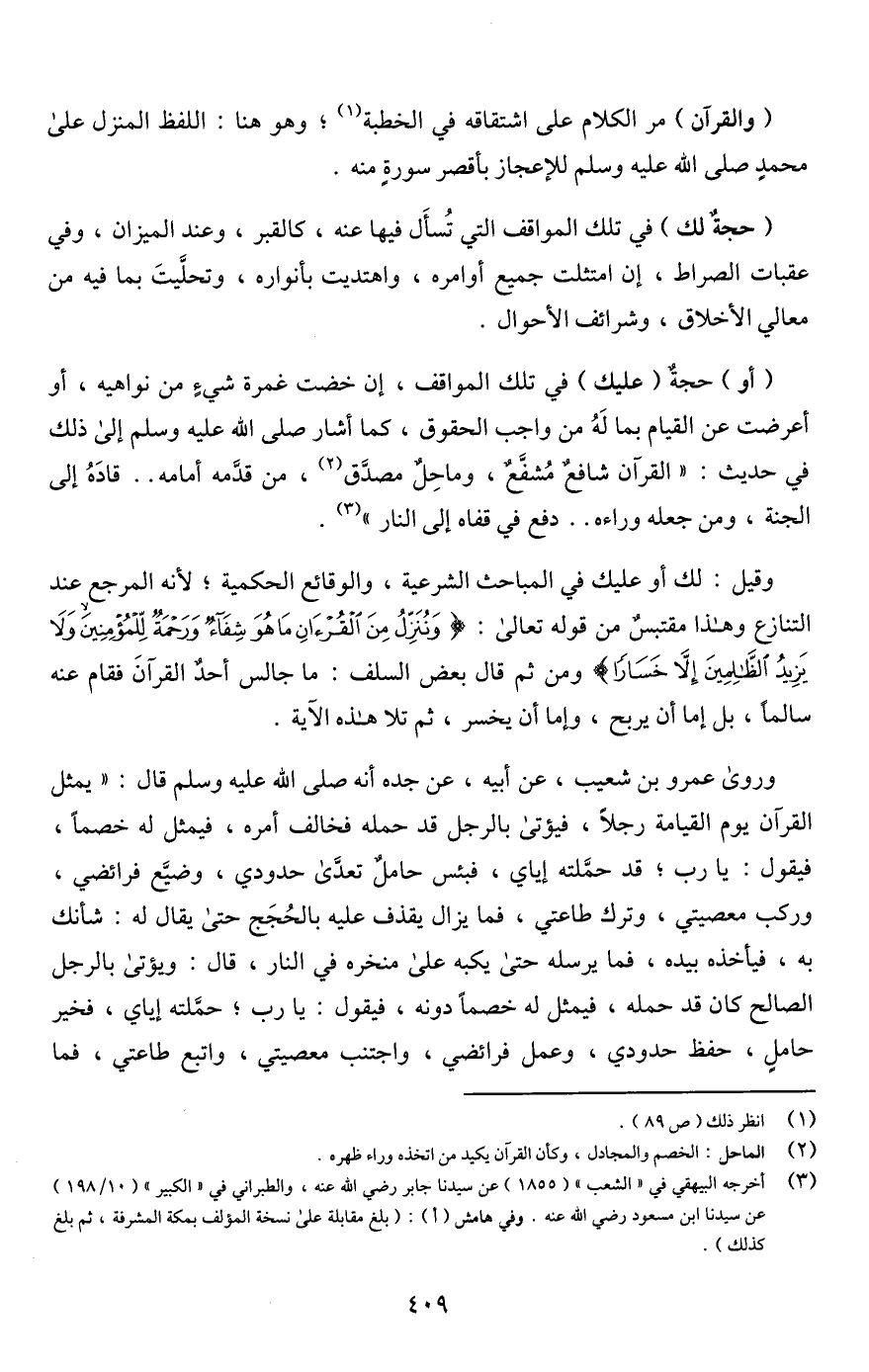 (حجةٌ لك) في تلك المواقف التي تُسأَل فيها عنه، كالقبر، وعند الميزان، وفي عقبات الصراط، إن امتثلت جميع أوامره، واهتديت بأنواره، وتحلَّيتَ بما فيه من معالي الأخلاق، وشرائف الأحوال.