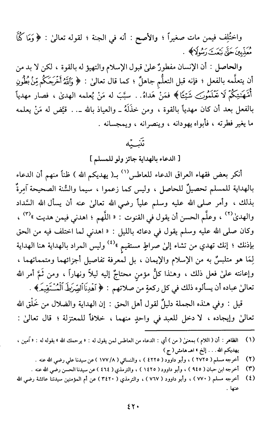 أنكر بعض فقهاء العراق الدعاء للعاطس (¬1) بـ (يهديكم اللَّه) ظنًا منهم أن الدعاء بالهداية للمسلم تحصيلٌ للحاصل، وليس كما زعموا، سيما والسُّنة الصحيحة آمِرةٌ بذلك، وأمر صلى اللَّه عليه وسلم عليًا رضي اللَّه تعالى عنه أن يسأل اللَّه السَّداد والهدى (¬2)، وعلَّم الحسن أن يقول في القنوت: "اللهم؛ اهدني فيمن هديت" (¬3)، وكان صلى اللَّه عليه وسلم يقول في دعائه بالليل: "اهدني لما اختلف فيه من الحق بإذنك؛ إنك تهدي من تشاء إلى صراطٍ مستقيمٍ" (¬4) وليس المراد بالهداية هنا الهداية لِمَا هو متلبسٌ به من الإسلام والإيمان، بل لمعرفة تفاصيل أجزائهما ومتمماتهما، وإعانته على فعل ذلك، وهذا كل مؤمنٍ محتاجٌ إليه ليلًا ونهارًا، ومن ثَمَّ أمر اللَّه تعالى عباده أن يسألوه ذلك في كل ركعةٍ من صلاتهم: {اهْدِنَا الصِّرَاطَ الْمُسْتَقِيمَ}.