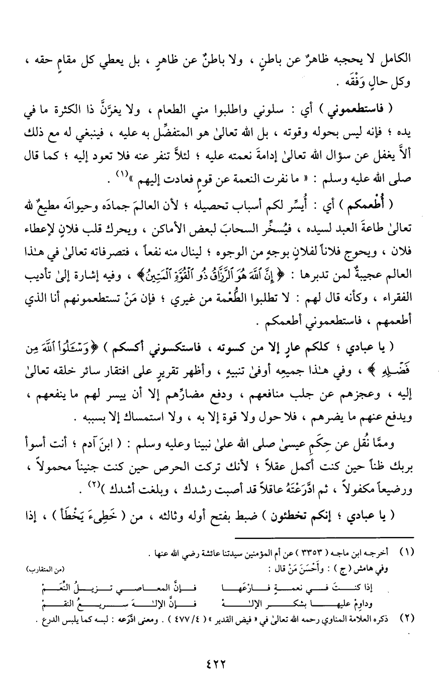 (فاستطعموني) أي: سلوني واطلبوا مني الطعام، ولا يغرَّنَّ ذا الكثرة ما في يده؛ فإنه ليس بحوله وقوته، بل اللَّه تعالى هو المتفضِّل به عليه، فينبغي له مع ذلك ألَّا يغفل عن سؤال اللَّه تعالى إدامةَ نعمته عليه؛ لئلَّا تنفر عنه فلا تعود إليه؛ كما قال صلى اللَّه عليه وسلم: "ما نفرت النعمة عن قومٍ فعادت إليهم" (¬1).