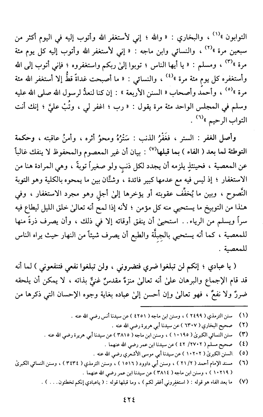 (يا عبادي؛ إنكم لن تبلغوا ضري فتضروني، ولن تبلغوا نفعي فتنفعوني) لما أنه قد قام الإجماع والبرهان على أنه تعالى منزةٌ مقدسٌ غنيٌّ بذاته، لا يمكن أن يلحقه ضررٌ ولا نفعٌ، فهو تعالى كان أحسن إلى عباده بغاية وجوه الإحسان التي ذكرها من