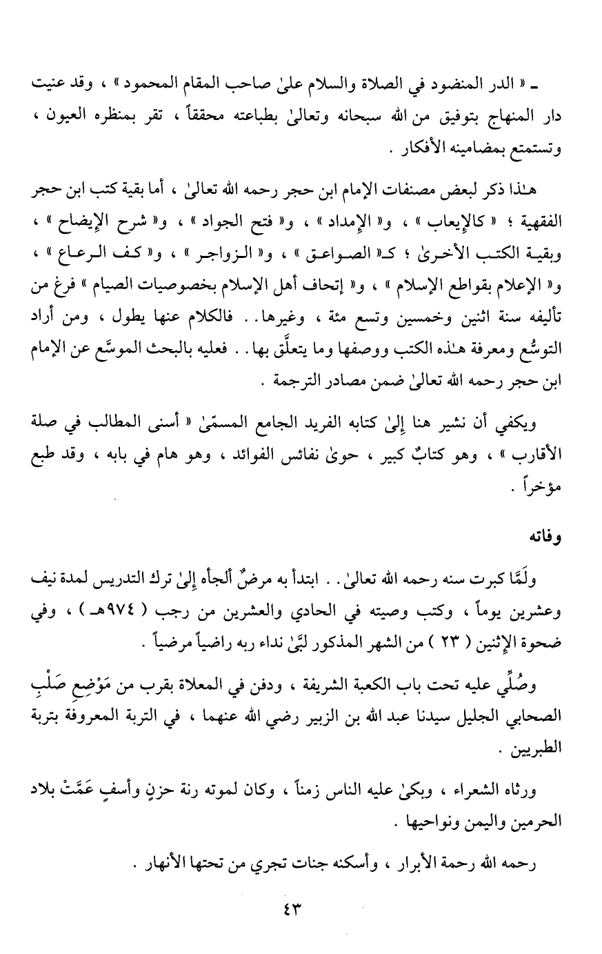 هذا ذكر لبعض مصنفات الإمام ابن حجر رحمه اللَّه تعالى، أما بقية كتب ابن حجر الفقهية؛ "كالإِيعاب"، و"الإِمداد"، و"فتح الجواد"، و"شرح الإِيضاح"، وبقية الكتب الأخرى، كـ"الصواعق"، و"الزواجر"، و"كف الرعاع"، و"الإعلام بقواطع الإسلام"، و"إتحاف أهل الإسلام بخصوصيات الصيام" فرغ من تأليفه سنة اثنين وخمسين وتسع مئة، وغيرها. . فالكلام عنها يطول، ومن أراد التوسُّع ومعرفة هذه الكتب ووصفها وما يتعلَّق بها. . فعليه بالبحث الموسَّع عن الإمام ابن حجر رحمه اللَّه تعالى ضمن مصادر الترجمة.