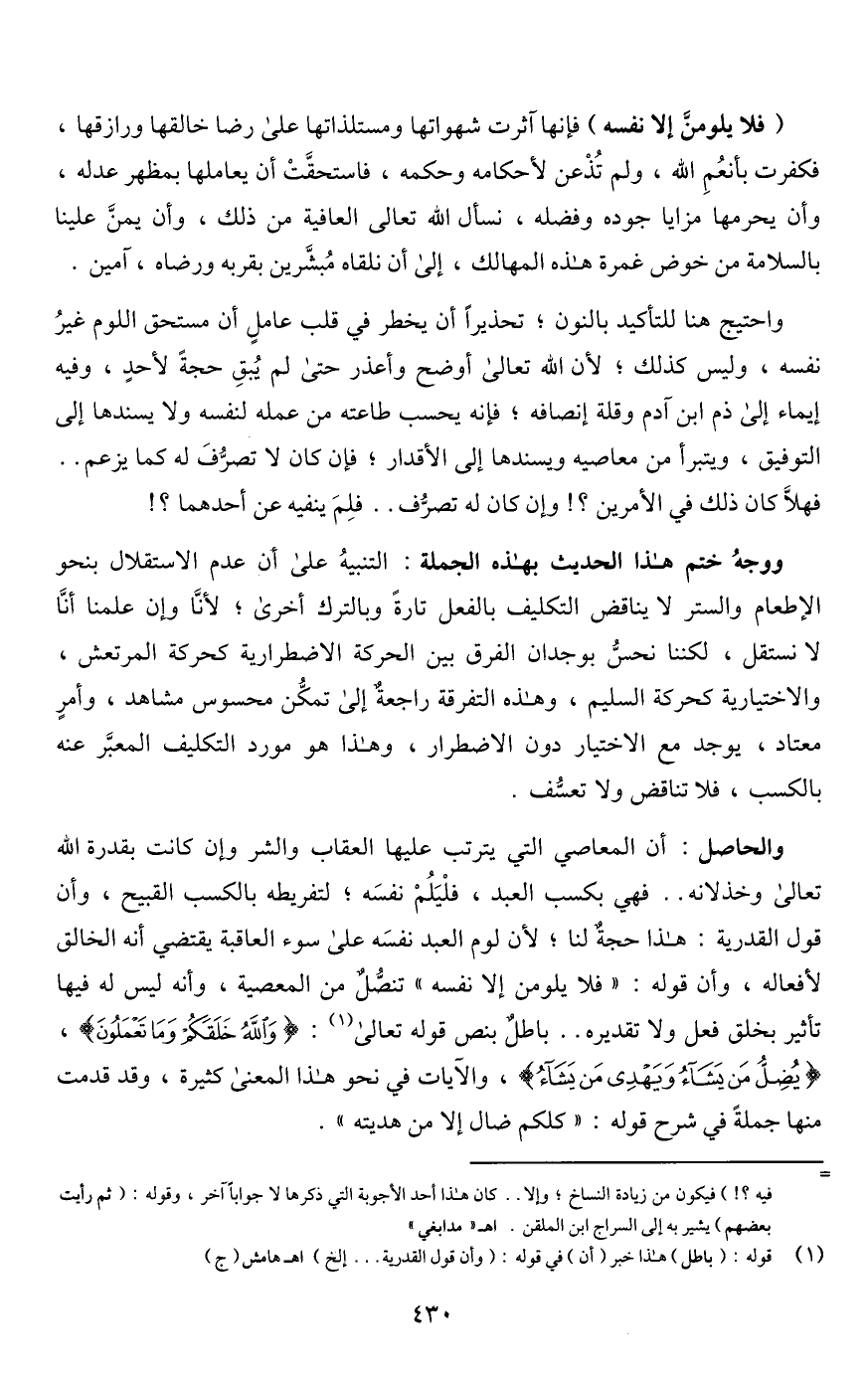 والحاصل: أن المعاصي التي يترتب عليها العقاب والشر وإن كانت بقدرة اللَّه تعالى وخذلانه. . فهي بكسب العبد، فلْيَلُمْ نفسَه؛ لتفريطه بالكسب القبيح، وأن قول القدرية: هذا حجةٌ لنا؛ لأن لوم العبد نفسَه على سوء العاقبة يقتضي أنه الخالق لأفعاله، وأن قوله: "فلا يلومن إلا نفسه" تنصُّلٌ من المعصية، وأنه ليس له فيها تأثير بخلق فعل ولا تقديره. . باطلٌ بنص قوله تعالى (¬1): {وَاللَّهُ خَلَقَكُمْ وَمَا تَعْمَلُونَ}، {يُضِلُّ مَنْ يَشَاءُ وَيَهْدِي مَنْ يَشَاءُ}، والآيات في نحو هذا المعنى كثيرة، وقد قدمت منها جملةً في شرح قوله: "كلكم ضال إلا من هديته".