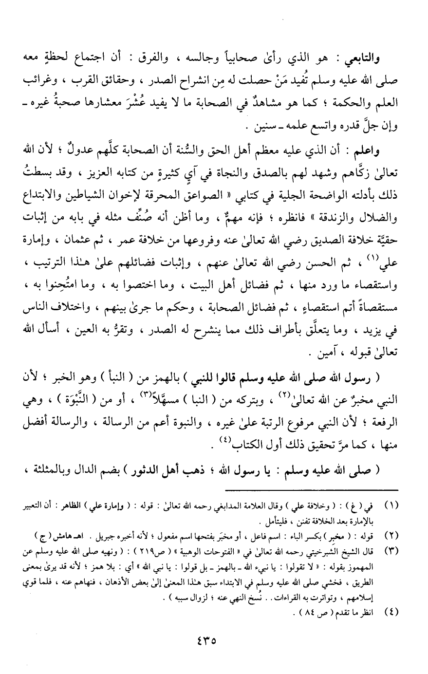 واعلم: أن الذي عليه معظم أهل الحق والسُّنة أن الصحابة كلَّهم عدولٌ، لأن اللَّه تعالى زكَّاهم وشهد لهم بالصدق والنجاة في آيٍ كثيرةٍ من كتابه العزيز، وقد بسطتُ ذلك بأدلته الواضحة الجلية في كتابي "الصواعق المحرقة لإخوان الشياطين والابتداع والضلال والزندقة" فانظره؛ فإنه مهمٌّ، وما أظن أنه صُنِّف مثله في بابه من إثبات حقيَّه خلافة الصديق رضي اللَّه تعالى عنه وفروعها من خلافة عمر، ثم عثمان، وإمارة علي (¬1)، ثم الحسن رضي اللَّه تعالى عنهم، وإثبات فضائلهم على هذا الترتيب، واستقصاء ما ورد منها، ثم فضائل أهل البيت، وما اختصوا به، وما امتُحِنوا به، مستقصاةً أتم استقصاءٍ، ثم فضائل الصحابة، وحكم ما جرى بينهم، واختلاف الناس في يزيد، وما يتعلَّق بأطراف ذلك مما ينشرح له الصدر، وتقرُّ به العين، أسأل اللَّه تعالى قبوله، آمين.