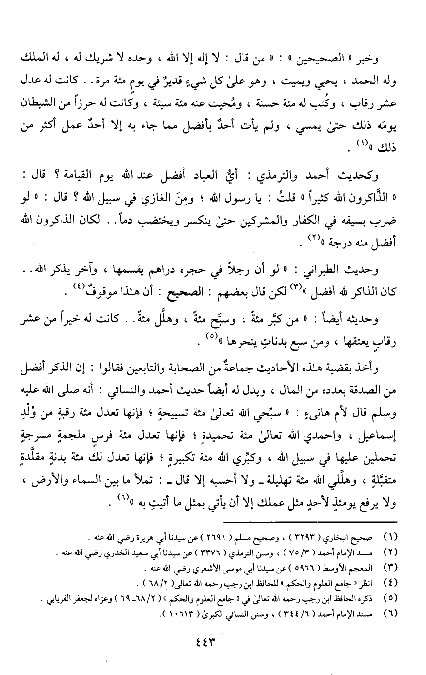 وأخذ بقضية هذه الأحاديث جماعة من الصحابة والتابعين فقالوا: إن الذكر أفضل من الصدقة بعدده من المال، ويدل له أيضا حديث أحمد والنسائي: أنه صلى اللَّه عليه وسلم قال لأم هانئٍ: "سبِّحي اللَّه تعالى مئة تسبيحةٍ؛ فإنها تعدل مئة رقبةٍ من وُلْدِ إسماعيل، واحمدي اللَّه تعالى مئة تحميدةٍ؛ فإنها تعدل مئة فرسٍ ملجمةٍ مسرجةٍ تحملين عليها في سبيل اللَّه، وكبِّري اللَّه مئة تكبيرةٍ؛ فإنها تعدل لك مئة بدنةٍ مقلَّدةٍ متقبَّلةٍ، وهلِّلي اللَّه مئة تهليلة -ولا أحسبه إلا قال-: تملأ ما بين السماء والأرض، ولا يرفع يومئذٍ لأحدٍ مثل عملك إلا أن يأتي بمثل ما أتيتِ به" (¬6).