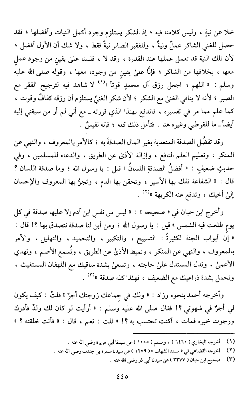 وأخرج ابن حبان في "صحيحه": "ليس من نفسِ ابن آدم إلا عليها صدقة في كل يومٍ طلعت فيه الشمس" قيل: يا رسول اللَّه؛ ومن أين لنا صدقة نتصدق بها؟! قال: "إن أبواب الجنة لكثيرةٌ: التسبيح، والتكبير، والتحميد، والتهليل، والأمر بالمعروف، والنهي عن المنكر، وتميط الأذى عن الطريق، وتُسمع الأصم، وتهدي الأعمى، وتدل المستدل على حاجته، وتسعى بشدة ساقيك مع اللهفان المستغيث، وتحمل بشدة ذراعيك مع الضعيف، فهذا كله صدقة" (¬3).