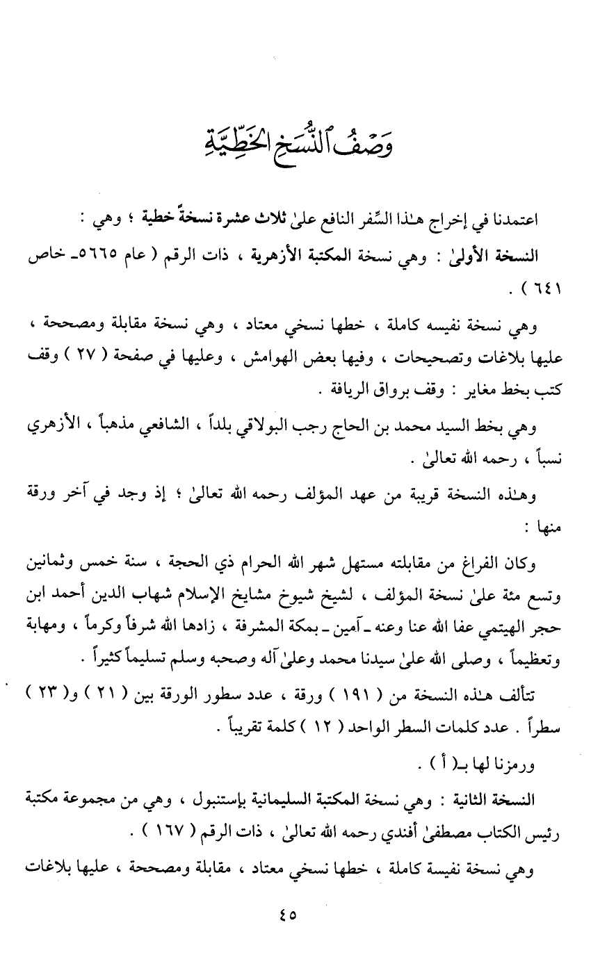 النسخة الأولى: وهي نسخة المكتبة الأزهرية، ذات الرقم (عام 5665 - خاص 641).