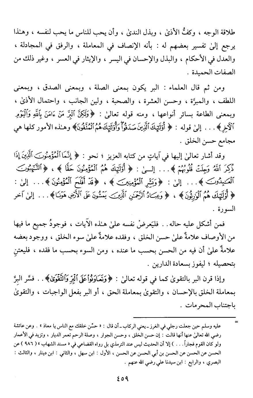 ومن ثم قال العلماء: البر يكون بمعنى الصلة، وبمعنى الصدق، وبمعنى اللطف، والمبرَّة، وحسن العشرة، والصحبة، ولين الجانب، واحتمال الأذى، وبمعنى الطاعة بسائر أنواعها، ومنه قوله تعالى: {وَلَكِنَّ الْبِرَّ مَنْ آمَنَ بِاللَّهِ وَالْيَوْمِ الْآخِرِ}. . . إلى قوله: {أُولَئِكَ الَّذِينَ صَدَقُوا وَأُولَئِكَ هُمُ الْمُتَّقُونَ} وهذه الأمور كلها هي مجامع حسن الخلق.