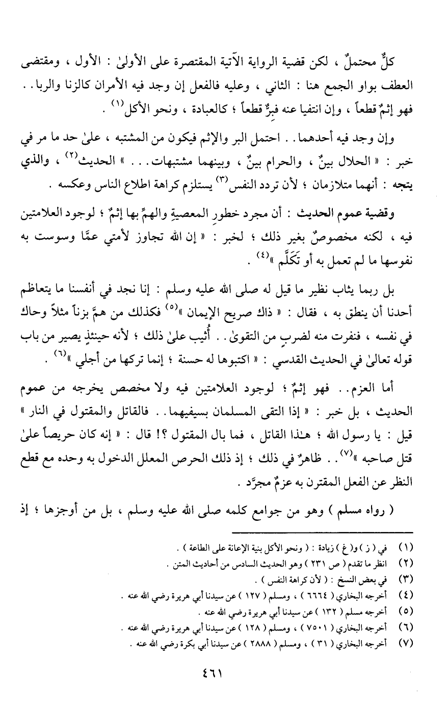 وقضية عموم الحديث: أن مجرد خطورِ المعصيةِ والهمِّ بها إثمٌ؛ لوجود العلامتين فيه، لكنه مخصوصٌ بغير ذلك؛ لخبر: "إن اللَّه تجاوز لأمتي عمَّا وسوست به نفوسها ما لم تعمل به أو تَكَلَّم" (¬4).