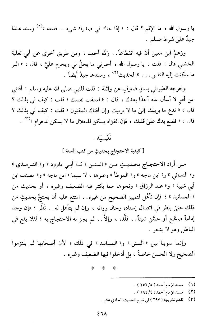 يا رسول اللَّه؛ ما الإثم؟ قال: "إذا حاك في صدرك شيء. . فدعه" (¬1) وسند هذا جيدٌ على شرط مسلم.